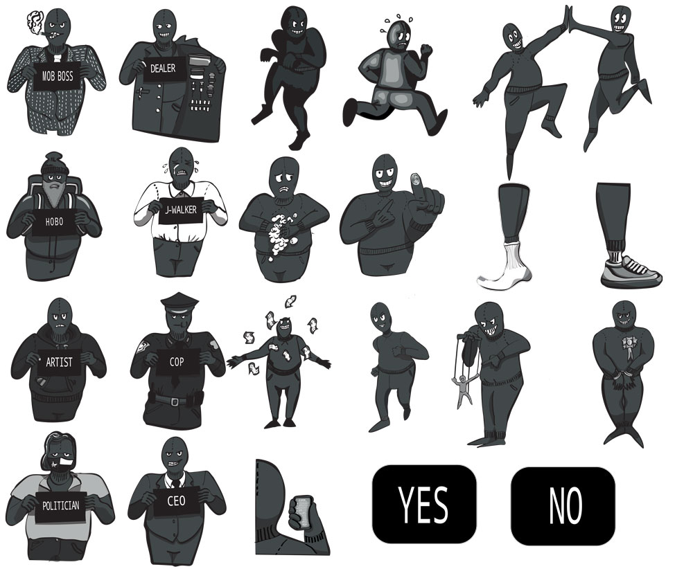 A simple personality quiz was created to study user-experience design. This quiz was developed first in a sketchbook filled with various questions and subsequent outcomes responding to the answers. The concept that the project was based around was what hypothetical criminal would the user identify with based on their responses to three questions. Illustrations in the quiz provided visual aid to the questions and the interface was supposed to be understandable to a participant without any instructions. Previous iterations of the illustrations included a palette with various hues in the details of each character; to reinforce cohesion and consistency, the palette was simplified to a grayscale that reinforced the strength of the concept with a “noir” tone and proved that simplification reaps unexpected benefits.